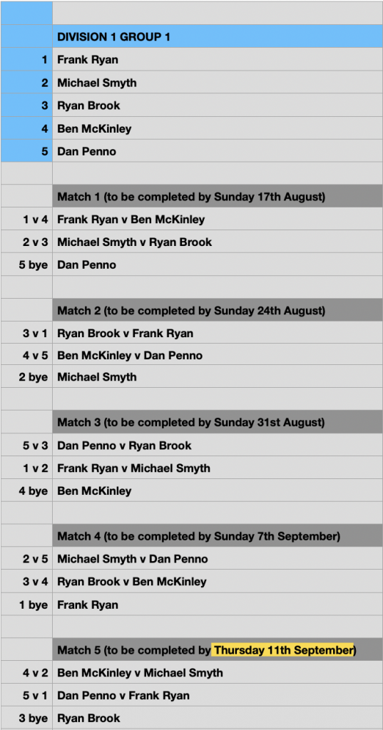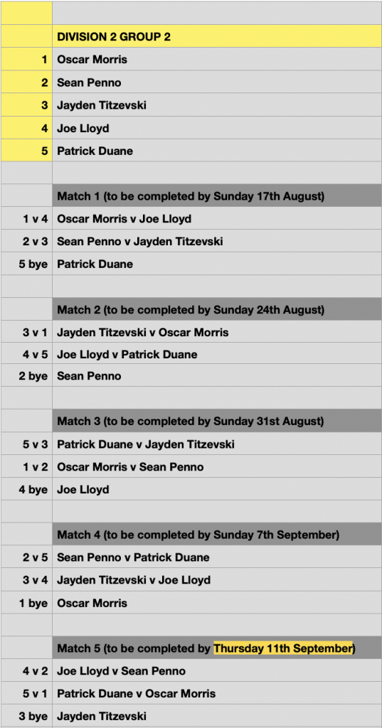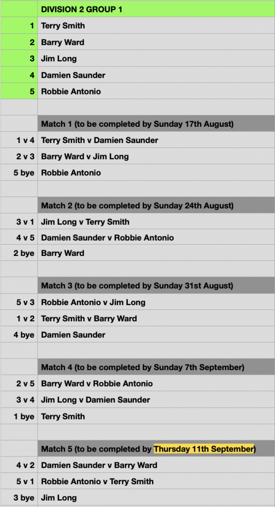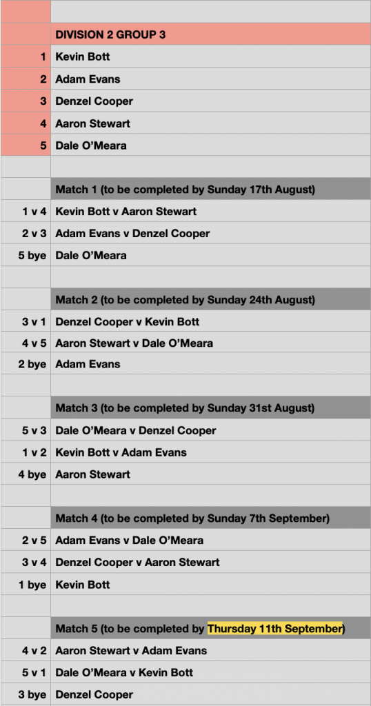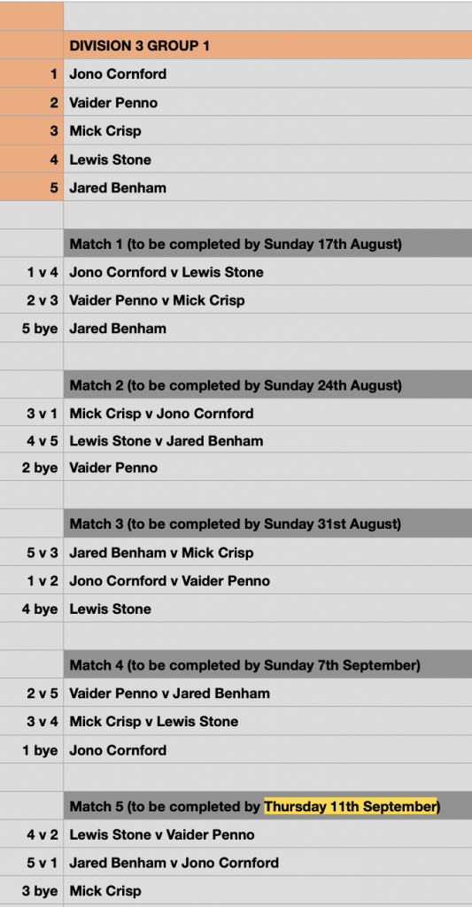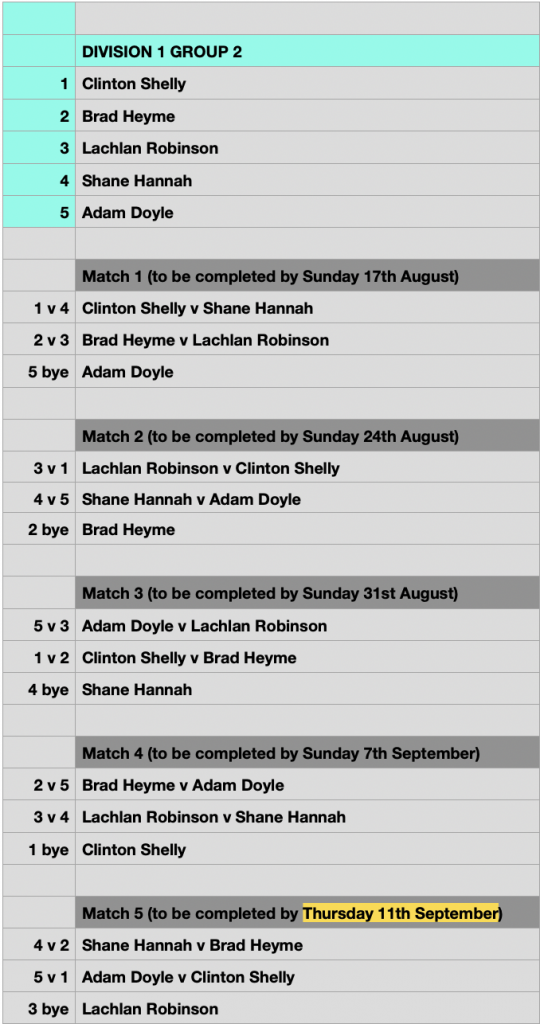 ** Please note that the final Round Robin match is to be played the same week of the Semi Finals and must be completed by THURSDAY 11th September. This means you only have 5 days to complete the final match, not 7 days, like all other RR matches.